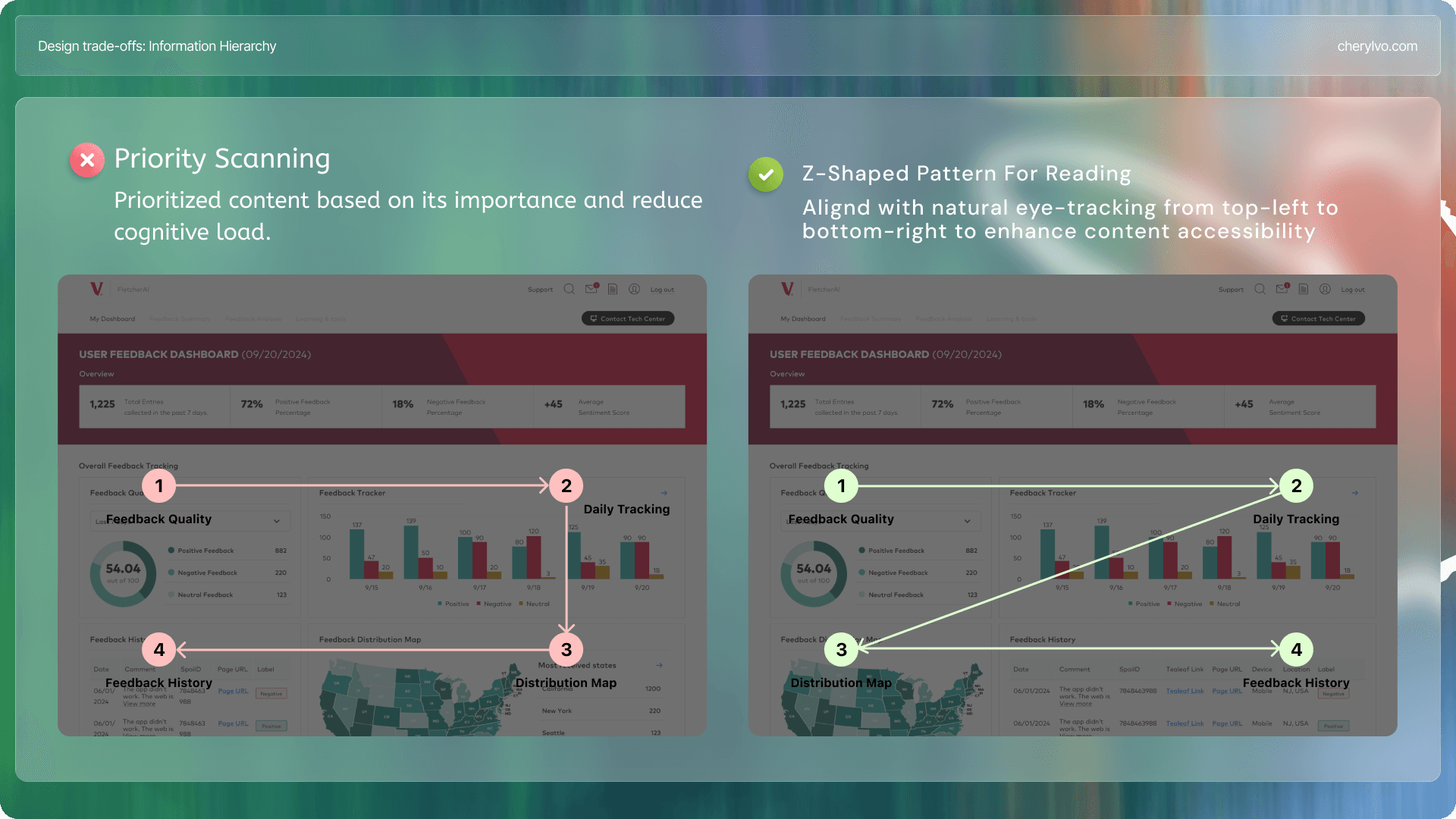 Through testing, we shifted to a Z-shaped reading pattern, which aligns with natural eye movement from top-left to bottom-right. This adjustment improved accessibility, reduced effort, and made it easier for teams to quickly grasp key insights without missing critical details.